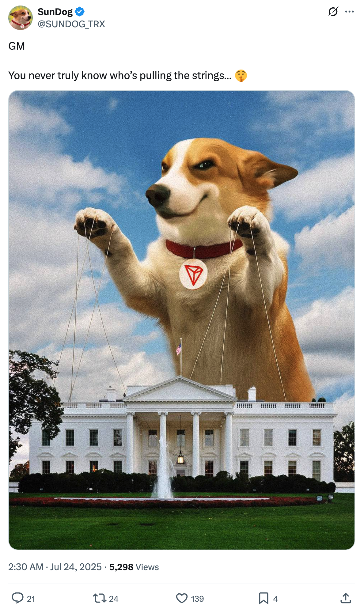 ![Tweet screenshot: SunDog @SUNDOG_TRX You never truly know who’s pulling the strings… 🤫 [AI-generated image of a corgi dog with a collar depicting the Tron logo, paws raised above the White House, with strings attached to the paws like a marionette] 2:30 AM Jul 24, 2025](https://storage.mollywhite.net/micro/0add1a4647959f313bac_Screenshot-2025-08-13-at-12.00.02---AM.png)