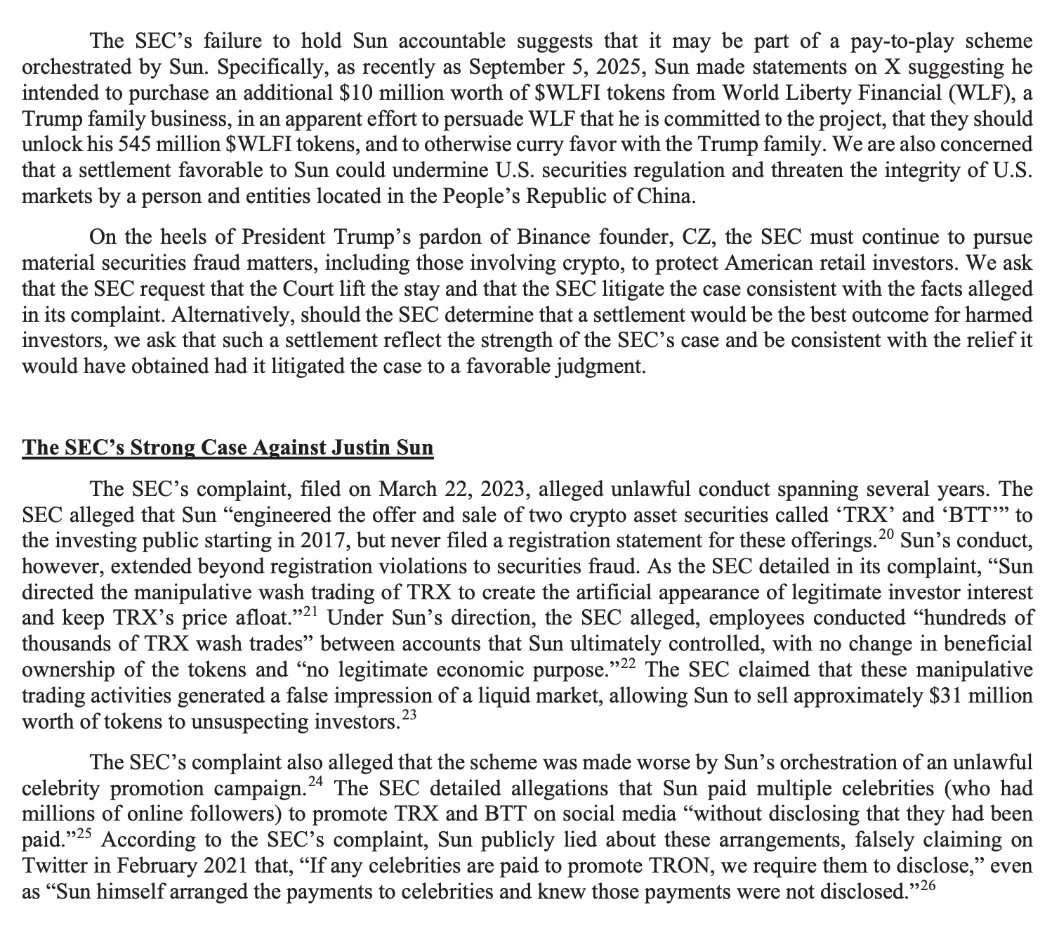 In January, House Financial Services Ranking Member Maxine Waters sent a letter to SEC Chair Paul Atkins expressing concern over the SEC's "retrenchment from crypto enforcement", citing the Sun case and urging Atkins to hold him accountable.