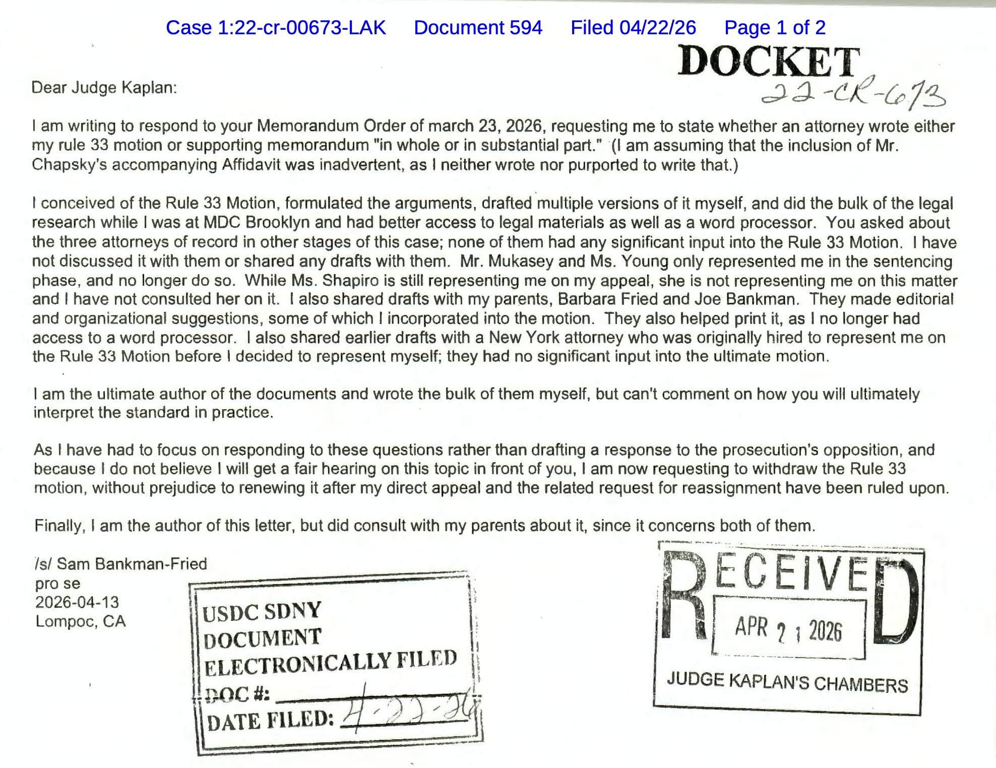 Sam Bankman-Fried’s affidavit has arrived. He says his attorneys of record had no input into his motion for a new trial, but that he shared drafts with his parents (both attorneys). “They made editorial and organizational suggestions, some of which I incorporated”
