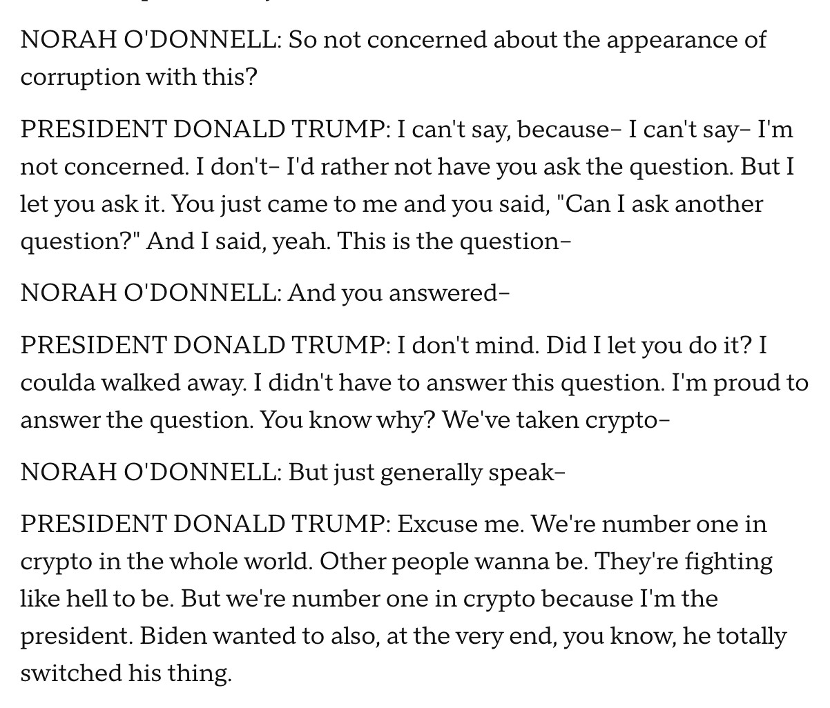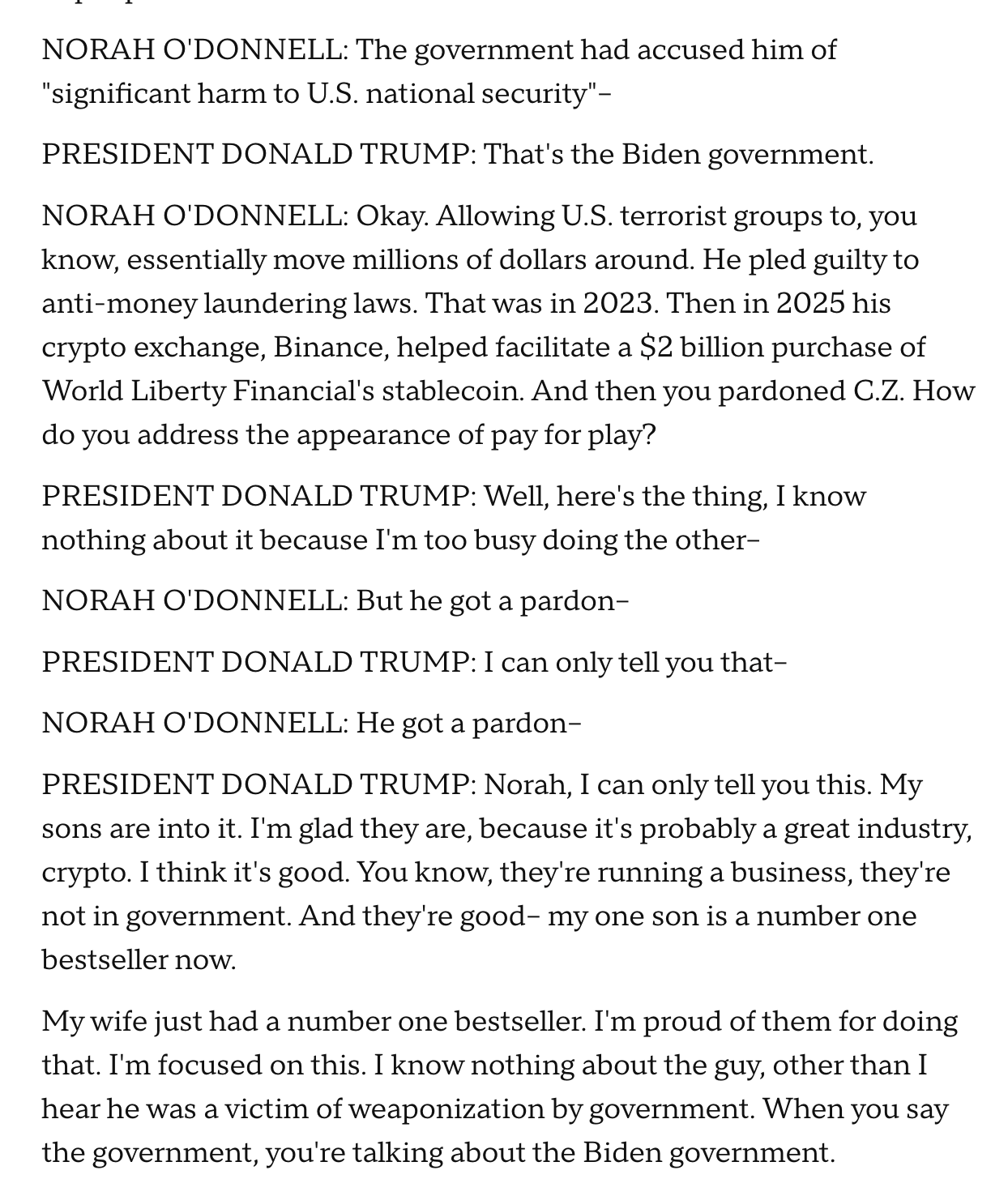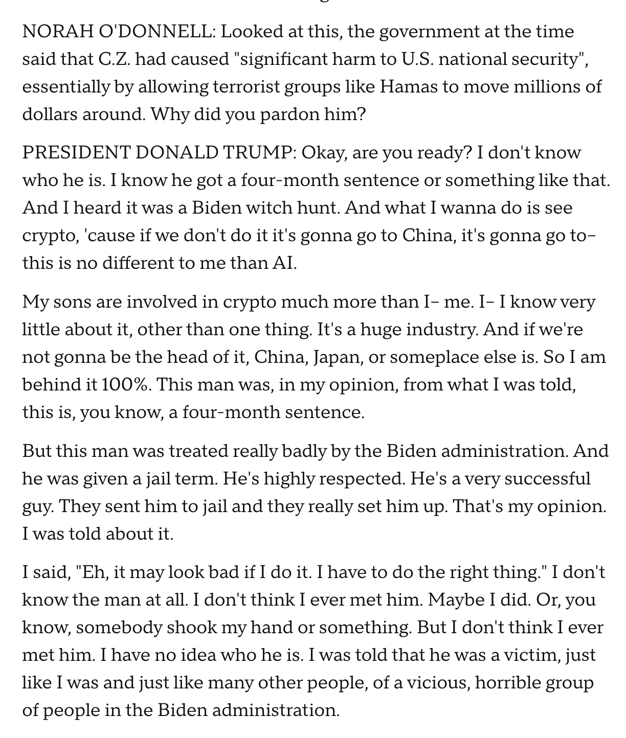 The full CBS interview with Trump about the pardon of Binance's Changpeng Zhao is shocking. "Why did you pardon him?" "I have no idea who he is. I was told that he was a victim ... They sent him to jail and they really set him up. That's my opinion. I was told about it."