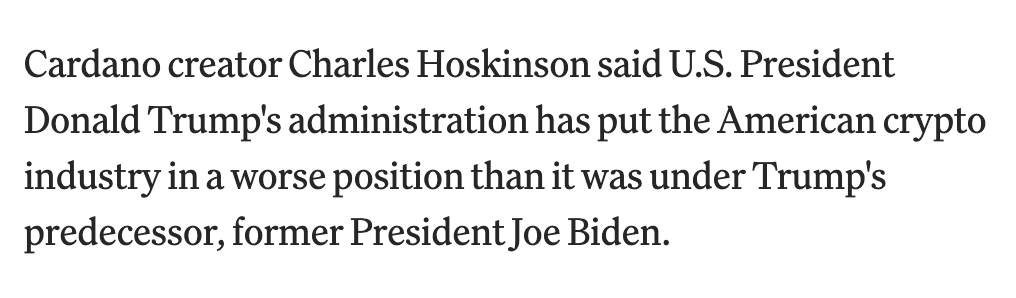 ![Cardano founder Charles Hoskinson has also clearly been trying to woo Trump, claiming very shortly after the election that he was “going to be spending quite a bit of time working with lawmakers in Washington DC and quite a bit of time with members of the administration to help foster and facilitate with other key leaders in industry the crypto policy”.6 While he has continued to boast vaguely about meetings with various influential figures, winkingly describing a “VIP dinner” where “diet coke will certainly be on [the menu]”, there’s been little outside confirmation that he’s had much access to the Trump administration.](https://storage.mollywhite.net/micro/ebf999a8f79f352f9173_Screenshot-2026-01-13-at-10.35.28---PM.png)