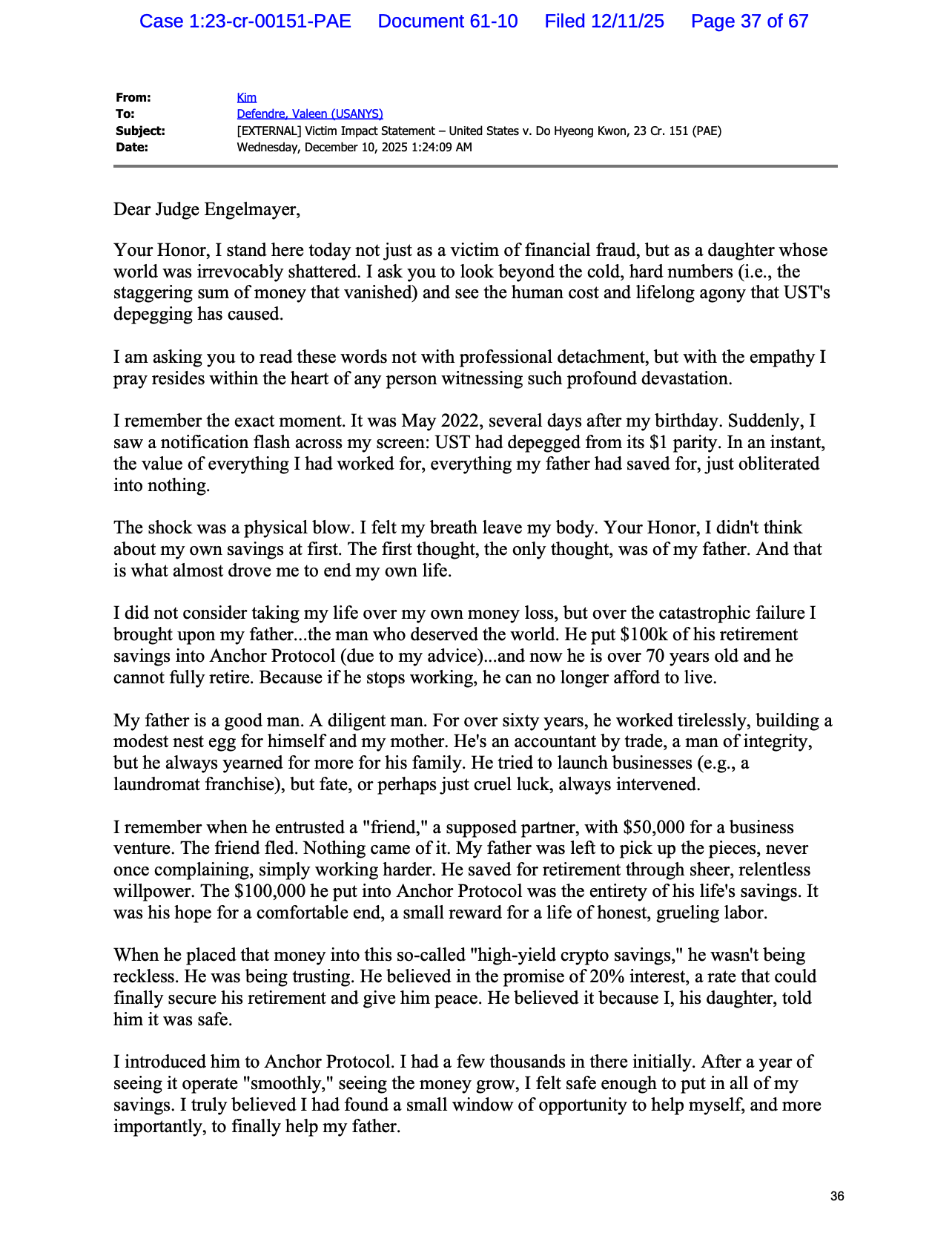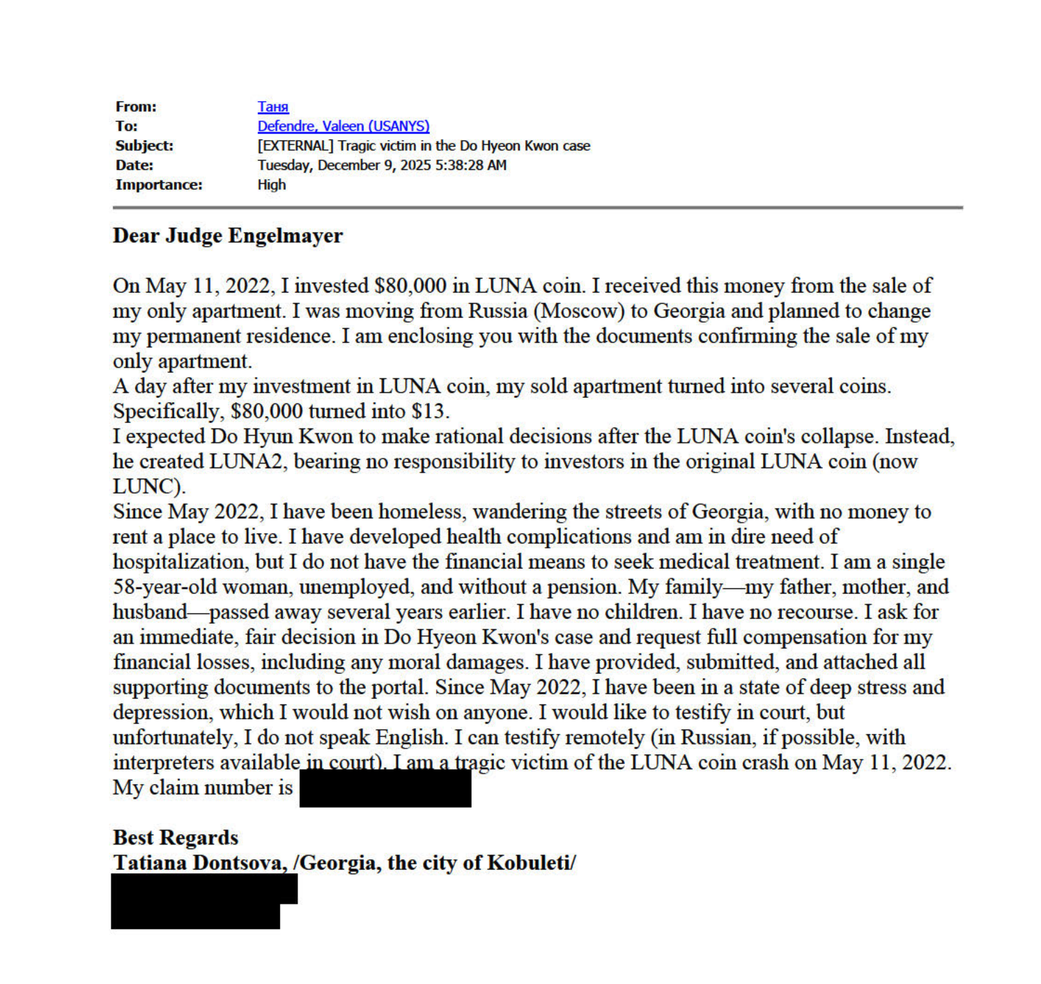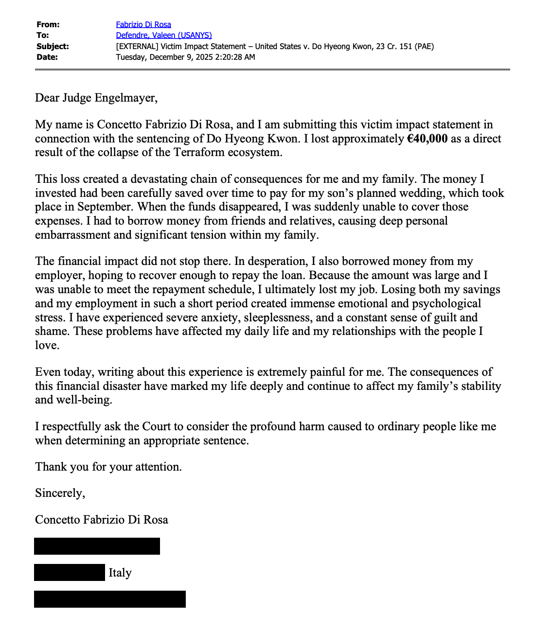 ![Hi, i was a victim of Do Kwon’s terra luna scam. I am a carer for my Dad, [redacted] and i invested money into terra luna believing that it was a profitable strategy to support my Dad better with medical expenses and being able to sacrifice taking time off work to support him. When i lost all of my funds in this scam i was devastated. I had to take out loans to get by to fund my Dad’s medical bills and just to get by with food and necessities for us both. I am still in debt to this day paying back loans and credit cards. My family has been through immense suffering and i suffer from depression daily since the losses of my life savings. I urge the honourable judge to please hand down harse sentencing to Do Kwon for the crimes that he has committed, i sincerely hope that justice will prevail to recieve some sollace from the torment he has put my family and i through. Kind regards Paul Lynn](https://storage.mollywhite.net/micro/542695386b9c27632d06_Screenshot-2025-12-11-at-5.05.38---PM.png)