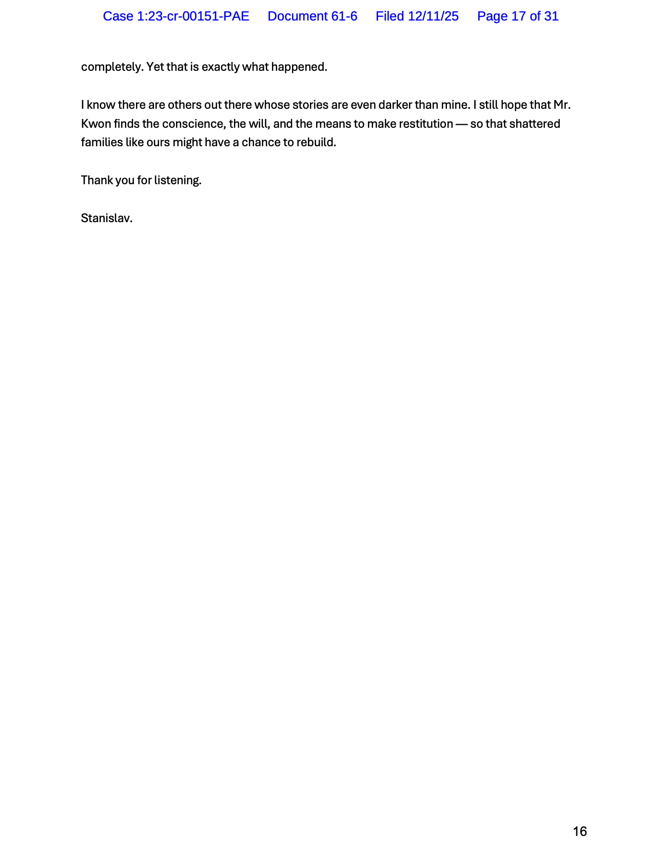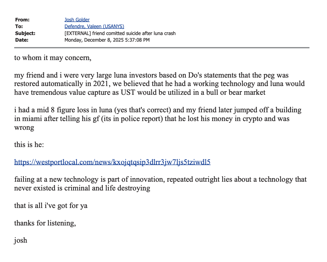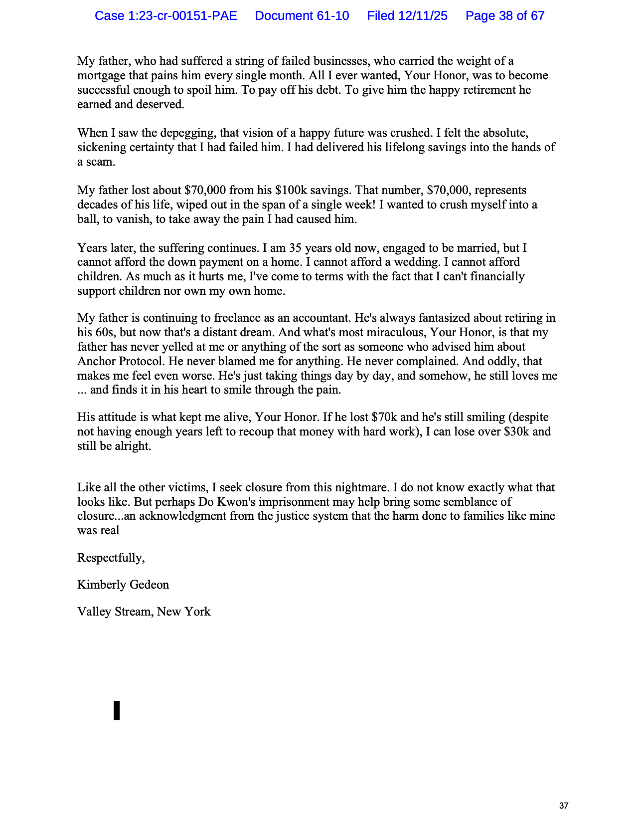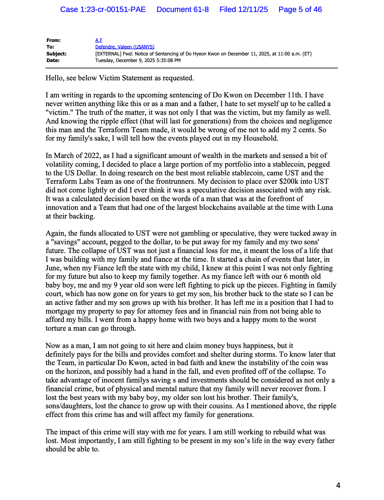 ![Hi, i was a victim of Do Kwon’s terra luna scam. I am a carer for my Dad, [redacted] and i invested money into terra luna believing that it was a profitable strategy to support my Dad better with medical expenses and being able to sacrifice taking time off work to support him. When i lost all of my funds in this scam i was devastated. I had to take out loans to get by to fund my Dad’s medical bills and just to get by with food and necessities for us both. I am still in debt to this day paying back loans and credit cards. My family has been through immense suffering and i suffer from depression daily since the losses of my life savings. I urge the honourable judge to please hand down harse sentencing to Do Kwon for the crimes that he has committed, i sincerely hope that justice will prevail to recieve some sollace from the torment he has put my family and i through. Kind regards Paul Lynn](https://storage.mollywhite.net/micro/542695386b9c27632d06_Screenshot-2025-12-11-at-5.05.38---PM.png)